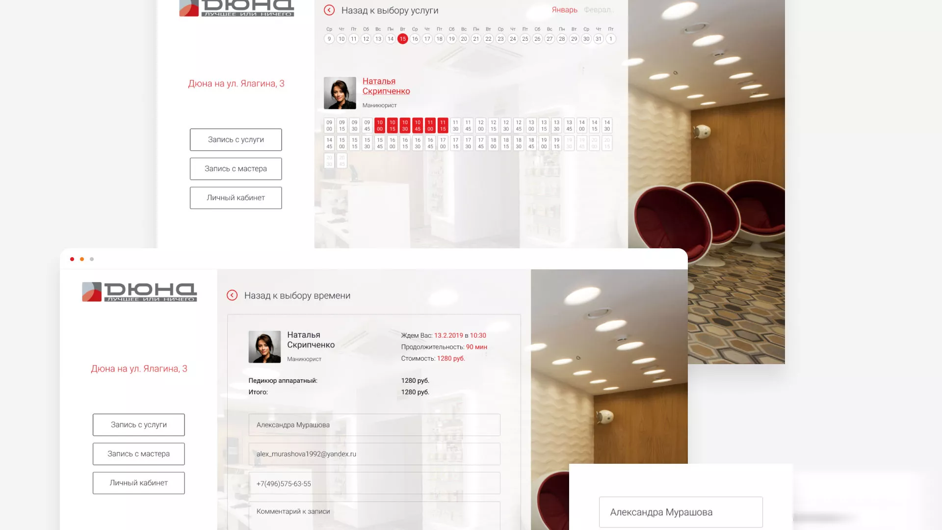 В разделе «Личный кабинет» содержатся все текущие записи в салоны красоты в Усть-Куте, с возможностью их отмены. Также, здесь можно редактировать свои персональные данные, ознакомиться с историей записей и видеть бонусы и акции салонов красоты.